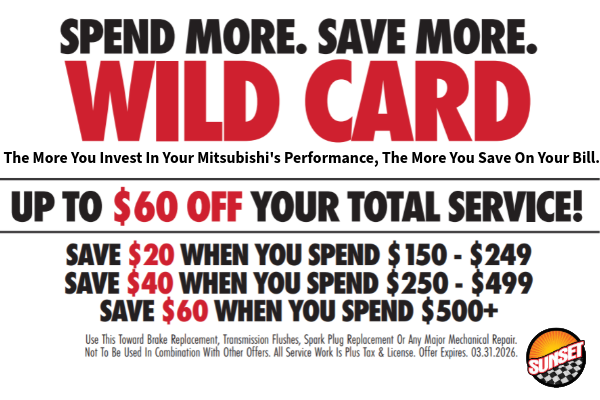 Valid at Sunset Mitsubishi only. Void where prohibited by law. Taxes not included in price. Coupon has no cash value. Environmental disposal fees may apply. Not to be combined with any other offers, Coupons, or prior discounts. Must present coupon in person at the time of arrival. Limit one coupon per customer per service item to receive these savings. Expires 03/31/26