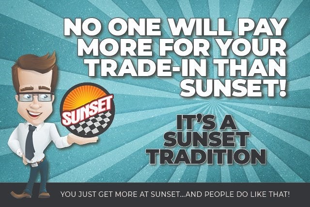 MSRP” is an acronym for Manufacturer’s Suggested Retail Price. This is required for all manufacturers to provide. MSRP is not an offer to sell at that price. It is the “Manufacturer’s Suggested Retail Price” before extras. “MSRP” will be exactly the same for any new vehicle with the exact same make, model, model year, equipment, and options at every franchise dealership in the United States. No dealer has a competitive advantage over another with MSRP. ‘Dealership price’ or ‘sale price’, when shown, reflects the sale price of the vehicle, including all applicable rebates and discounts unless expressly shown differently. Accessories & dealer-installed modifications are included in the “Dealership Price”. ‘Dealership price’ or ‘sale price’ does not include tax, title, government fees, a negotiable $200 document processing fee, license, vehicle registration or any financing fees. Contact us for details on any applicable fees or taxes that may apply to your specific situation. Sunset will always provide you with a clear and transparent summary of the final sale price and all applicable fees and taxes. All vehicles are “one only” and are identified by VIN and/or stock number. Some manufacturer discounts, rebates, incentives, and special financing cannot be combined or stacked. Not all customers qualify for all available manufacturer discounts, rebates, incentives, and special financing. Contact the dealership to verify which manufacturer discounts, rebates, incentives, and special financing you qualify for. Sunset will work to ensure that you will receive all applicable manufacturer incentives. All prices, specifications, and availability subject to change without notice. Contact dealer for most current information. While we make every reasonable effort to ensure the accuracy of the information displayed on this website, some prices may not include dealer installed added options, some features and options listed may not apply to this Sunset Vehicle. Please verify any information in question with a dealership sales representative prior to any negotiations. Customers should verify the existence and condition of any equipment listed. EPA Estimates Only. Your actual MPG may vary based on your driving characteristics. All offers expire on close of business the day subject content is removed from website, and all financing is subject to credit approval. All transactions are negotiable including price, trade allowance, interest rate (of which the dealer may retain a portion), term, and documentary service fee. Any agreement is subject to execution of contract documents. Warranty Protection for Life™ is included on all qualifying new and pre-owned vehicles. Some restrictions may apply. Contact the dealership for details on your vehicle of interest. This warranty is honored at any ASE certified repair facility in The United States and Canada. Note: There is now a modest $200 deducible per claim. Manufacturer maintenance requirements and records are mandatory. Contact dealer for complete details. There are some vehicles that are not eligible for this coverage. A complete list of ineligible vehicles is available upon request. Warranty Protection for Life is not included on vehicles purchased by a business entity or used for Commercial & Fleet purposes. Owners are responsible for maintaining their vehicle according to the original manufacturer’s recommendations. Failure to do so or keep records may void your warranty. Aftermarket vehicle modifications may void your warranty. Contact dealer or review your warranty agreement for details on maintaining this coverage. Sunset’s Oil Changes for Life is included on all qualifying new and pre-owned vehicles. Some restrictions may apply. Contact the dealership for details on your vehicle of interest. See dealer for complete details. There are some vehicles that are not eligible for this coverage. A complete list of ineligible vehicles is available upon request. Verify prior to purchase if a vehicle comes with either Warranty Protection for Life or Oil Changes for Life. Although every reasonable effort has been made to ensure the accuracy of the information contained on this site, absolute accuracy cannot be guaranteed. This site, and all information and materials appearing on it, are presented to the user "as is" without warranty of any kind, either express or implied. All vehicles are subject to prior sale. Price does not include applicable tax, title, and license charges. ‡Vehicles shown at different locations are not currently in our inventory (Not in Stock) but can be made available to you at our location within a reasonable date from the time of your request, not to exceed one week. If you have any questions about or would like clarification on any information found on this website, please contact us. The Manufacturer’s Suggested Retail Price excludes tax, title, license, dealer fees and optional equipment. Dealer sets final price.